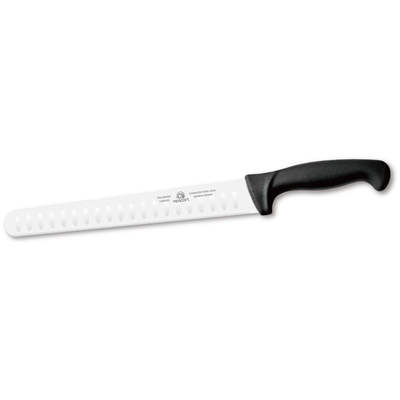Made from durable stainless steel, this slicing knife features a Granton edge that reduces friction and prevents meat from sticking to the blade. It is ideal for professional kitchens, BBQ restaurants, catering services, and outdoor cooking environments.