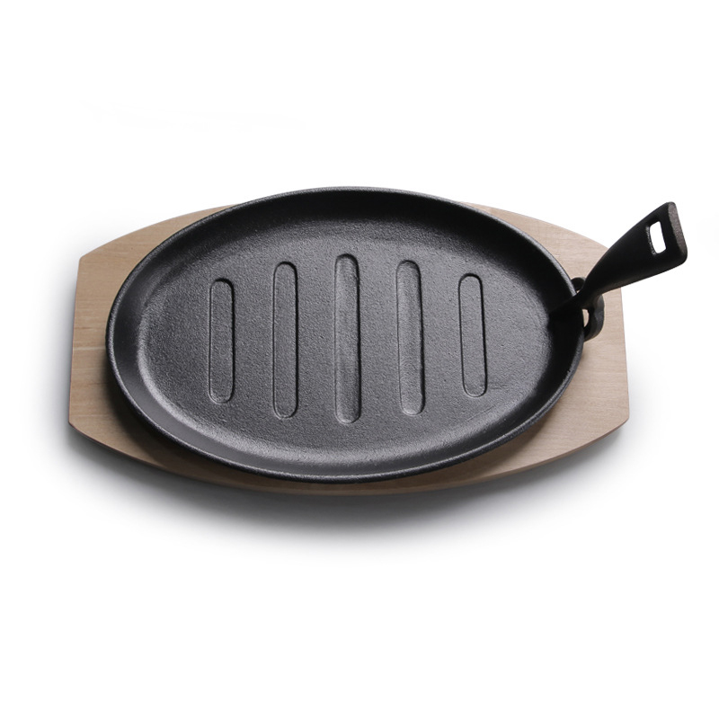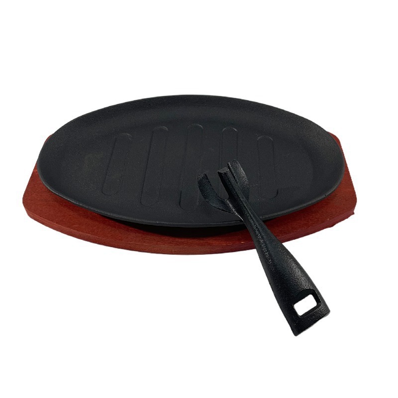 The fajita plate comes with a heat-resistant wooden base, allowing the hot cast iron plate to be safely placed on the dining table without causing damage to surfaces. The wooden base also provides stability and makes it easier to handle the sizzling plate.