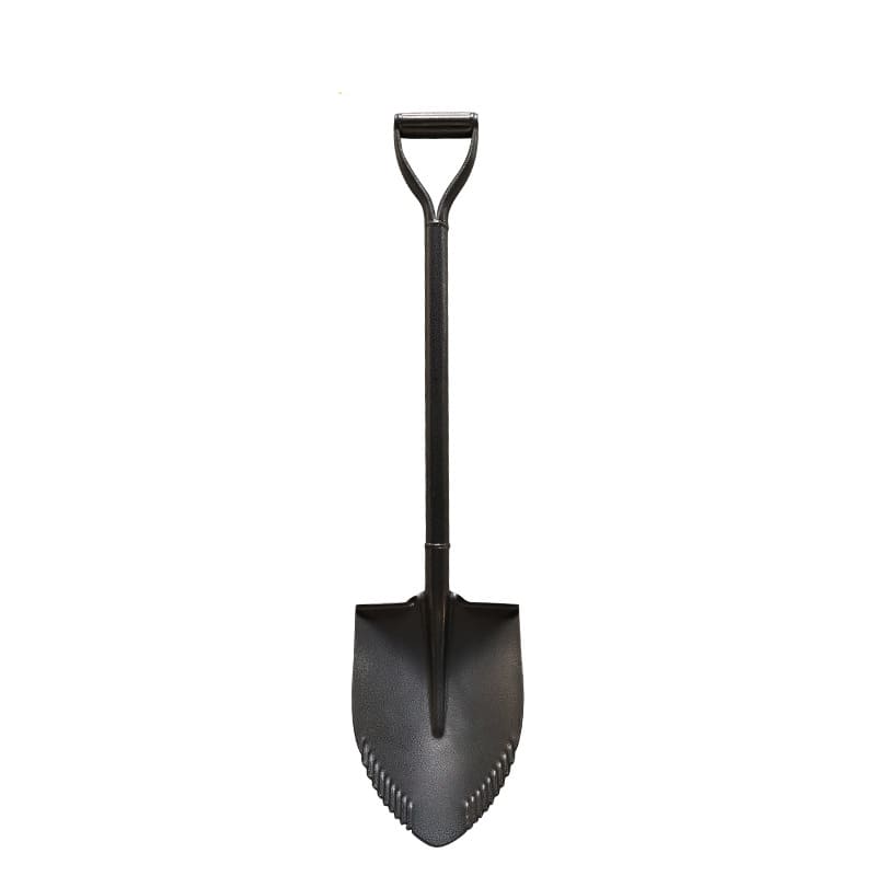 This manganese steel serrated digging shovel is designed for tough soil conditions. The pointed blade allows easy penetration into hard ground. The serrated edges improve cutting performance when working with roots and compact soil. It is suitable for professional outdoor use.